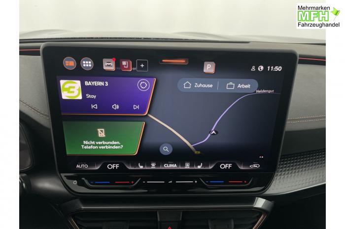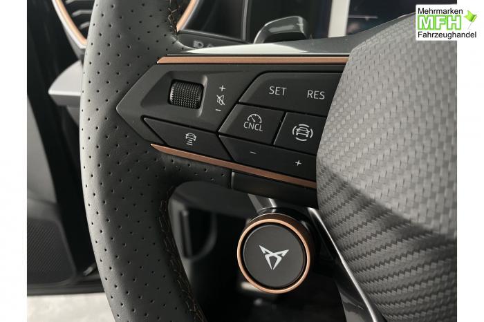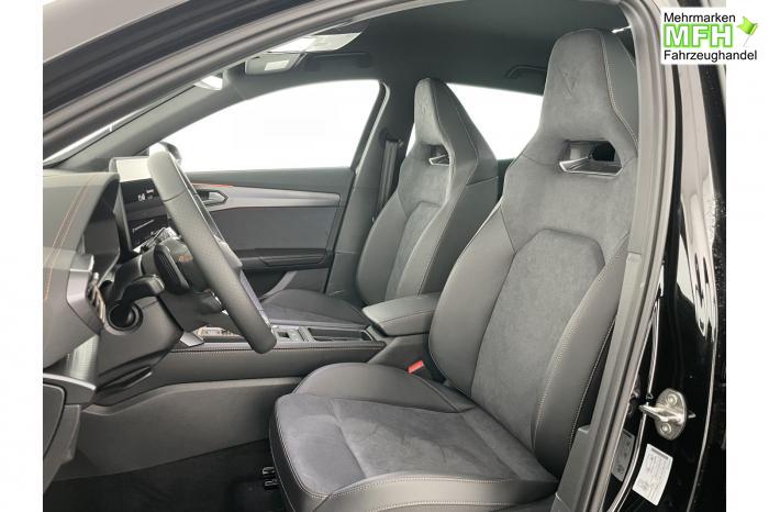 6 Lautsprecher, Connectivity Box inkl. Wireless Charger, Digitaler Radioempfang DAB , Navigationssystem, USB-C-Schnittstelle 2 vorne / 2 hinten (Ladefunktion), Wireless Full Link Connectivity inkl. Android Auto und Apple CarPlay, Automatische Coming- und Leaving-Home-Funktion, Infinity Light, Dynamisches LED-Lichtband am Heck und beleuchtetem CUPRA Logo, Lichtsensor, Matrix-LED-Scheinwerfer mit Signatur Ceremony, Smart Ambient Light, Türeinstiegsleisten beleuchtet, vorne, Voll-LED-Heckleuchten, Fensterheber elektrisch, mit Einkleschutz und One-Touch-Funktion, Seitenscheiben ab 2. Sitzreihe und Heckscheibe dunkel getönt, CUPRA Supersport-Multifunktionslenkrad mit CUPRA Mode Selector, beheizbar, Dachhimmel in Schwarz, Innenspiegel automatisch abblendend, Mittelarmlehne vorn, Variabler Gepäckraumboden mit Staufächern im Gepäckraum, Climatronic mit 3-Zonen-Temperaturregelung, Dynamic Design Paket, Edge Paket, Intelligent Drive Paket XL (Spurwechselassistent ''Side Assist'' inkl. Totwinkel- und Ausparkassistent mit Ausstiegswarnung Spurhalteassistent Plus inkl. Travel Assist, Emergency Assist und Stauassistent PreCrash Assist (Proaktives Insassenschutzsystem) Top View Kamera Parklenkassistent ''Intelligenter Park Assist''), Licht-und-Sicht Paket, Pure Performance Paket inkl Matrix LED-Scheinwerfern, Winter-Paket (Vordersitze beheizbar), 19 Leichtmetallräder Sandstorm Black/ Copper, glanzgedreht, Airbag für Fahrer und Beifahrer, Beifahrerairbag-Deaktivierung, Diebstahl-Warnanlage inkl. Innenraumüberwachung, Back-up-Horn und Abschleppschutz, ISOFIX-Kindersitz-Sicherungssystem, in der 2. Sitzreihe links und rechts inkl. Top-Tether-Verankerungspunkte, Kopfairbag-System, vorne und hinten, Notruf-Service, PreCrash Assist (Proaktives Insassenschutzsystem), Seitenairbag für Fahrer und Beifahrer, Seitenairbags hinten, CUPRA Sportschalensitze vorne mit Sitzmittelbahn in Dinamica, in Soul Schwarz mit Akzenten in Astro Blau, Fahrersitz elektrisch einstellbar mit Memory Funktion, Lendenwirbelstütze Fahrerseite, elektrisch einstellbar, Rücksitzlehne asymmetrisch geteilt umklappbar, Anschlussgarantie 3 Jahre / 100.000 km, CUPRA Connect Plus (3 Jahre), Automatische Distanzregelung ACC, CUPRA Drive Profile, Elektronische Parkbremse inkl. Auto Hold Funktion, Exit Assist, Fernlichtassistent, Intelligenter Parklenkassistent, Kessy Advanced, Schlüsselloses Schließ- und Öffnungssystem, Müdigkeitserkennung, Regensensor, Reifenkontrollanzeige, Rückfahrkamera, Side Assist inkl. Totwinkelassistent, Spurhalteassistent Plus inkl. Travel Assist, Emergency Assist und Stauassistent, Top View Kamera, Ultraschall-Einparkhilfe, vorne und hinten, Umfeldbeobachtungssystem Front Assist mit City-Notbremsfunktion, Virtual Cockpit, Adaptive Fahrwerksregelung DCC, Anhängevorrichtung, schwenkbar mit elektrischer Entriegelung und Anhängerrangierassistent, Außenspiegel elektrisch einstell-, anklapp- und beheizbar, Außenspiegelkappen in Dark Aluminium, Dachreling in Glossy Black, Heckklappe elektrisch betätigt (Öffnung & Schließung) inkl. Sensorgesteuerter Öffnung & Schließung (Virtual Pedal), Leisten an den Seitenfenstern (außen) in Glossy Black, EU-Fahrzeug mit Tageszulassung
