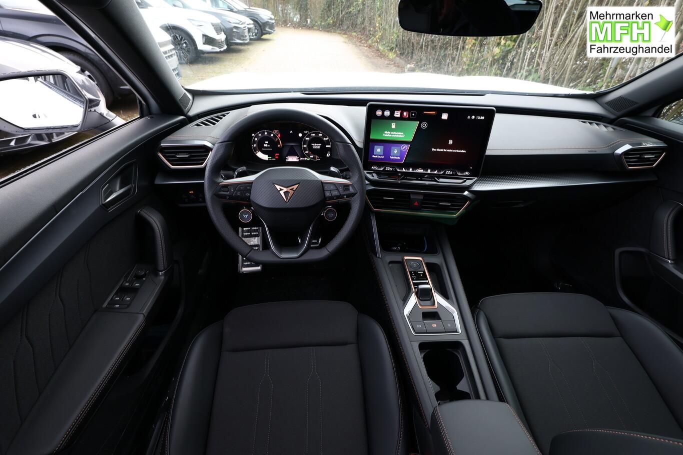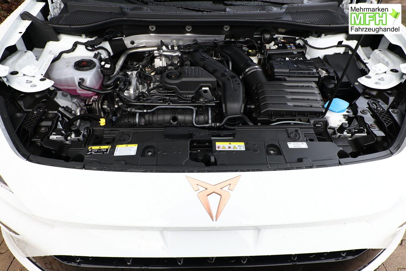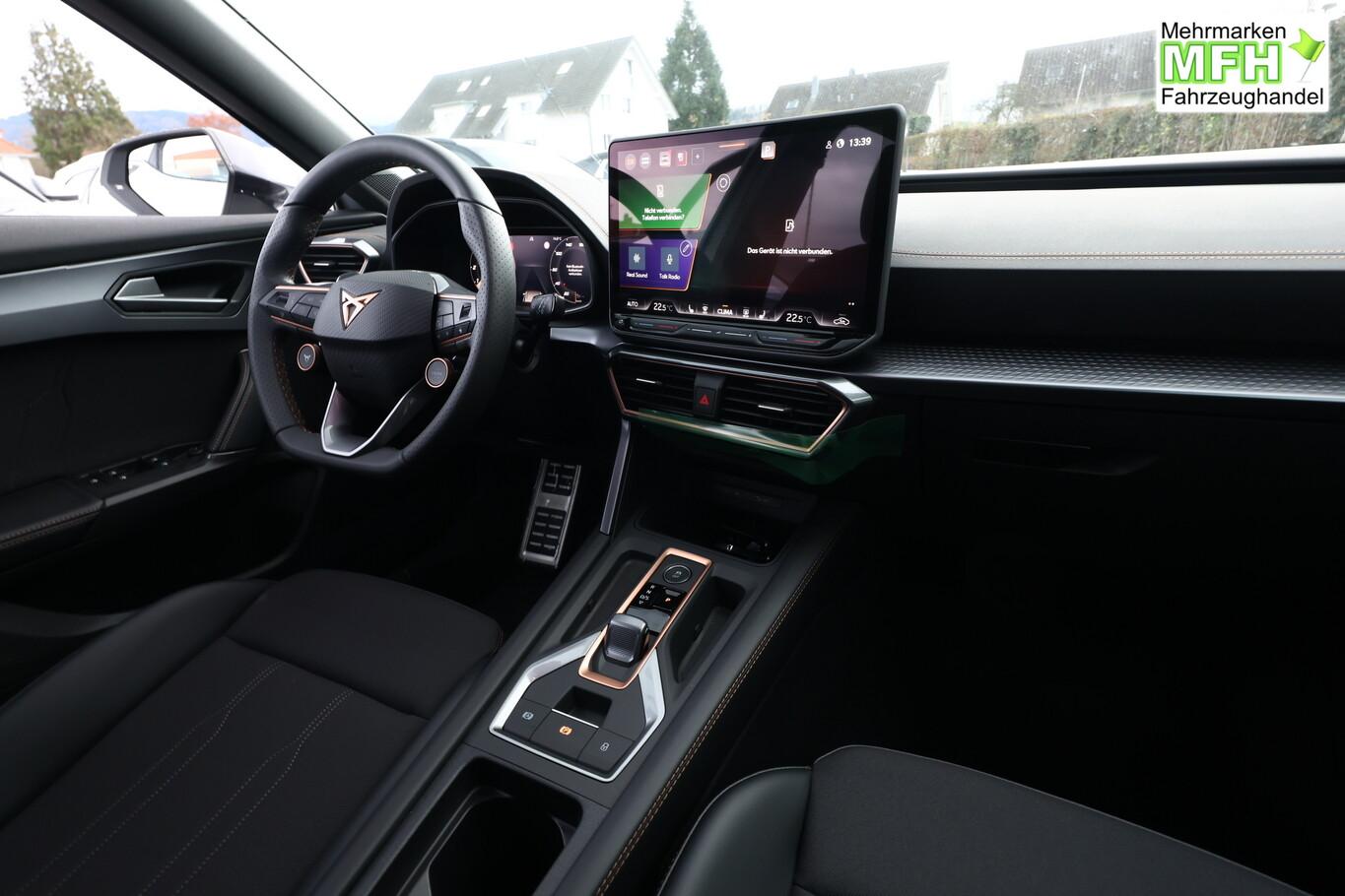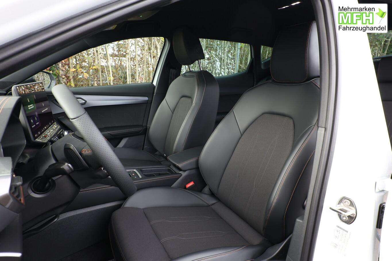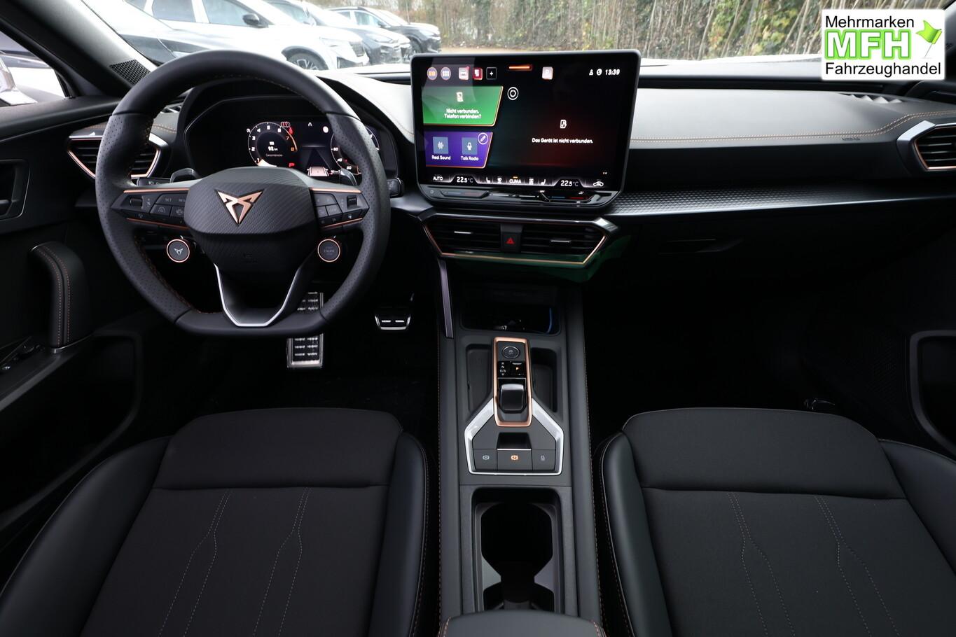 Heckklappe/-Deckel elektr. betätigt (öffnen + schliessen, sensorgesteuert), Winter-Paket (Sitzheizung vorn), Rückfahrkamera, Ambiente-Beleuchtung Smart Ambient Light, Dachhimmel schwarz, Full Link (MirrorLink, Apple CarPlay und Android Auto), Induktionsladeschale für Smartphone, Audiosystem mit 12,9 Zoll Farb-Touchscreen, Außenspiegelgehäuse in Dark Aluminium, Diebstahl-Warnanlage, Einparkhilfe vorn und hinten, Fahrassistenz-System: Verkehrszeichenerkennung, Frontscheibe in Wärmeschutzverglasung, Lenkrad mit Fahrmodusauswahl, Leseleuchten vorn und hinten, LM-Felgen 18 Zoll (Tempest), Navigation in Verbindung mit dem Smartphone (über Apple Carplay / Android Auto / ...), Pedale Aluminium, Reifen 245/45 R18, Schadstoffarm nach Abgasnorm Euro 6e (EU6EA), Licht- und Sicht-Paket (Innenspiegel mit Abblendautomatik / Licht- und Regensensor / Lichtassistent (Coming Home, Leaving Home)), Schließ-/Startsystem Kessy Advanced (Zentralverriegelung mit Fernbedienung), Heckleuchten Voll-LED mit dynamischem Lichtband (Infinite Light) (Heckleuchten LED mit dynamischem Blinklicht), Scheinwerfer Voll-LED (Leuchtweitenregelung automatisch / Tagfahrlicht LED), Einstiegsleisten (Aluminium) vorn, beleuchtet, Fensterzierleisten schwarz hochglänzend, Karosserie: 5-türig, Kombiinstrument digital (virtual cockpit), Laderaumboden variabel und herausnehmbar, Lendenwirbelstütze Sitz vorn links, verstellbar, Lendenwirbelstütze Sitz vorn rechts, verstellbar, Mittelarmlehne hinten, Motor 1,5 Ltr. - 110 kW 16V TSI ACT, Otto-Partikelfilter (OPF), Radstand 2679 mm, Sitz vorn links höhenverstellbar, Sitz vorn rechts höhenverstellbar, Sitzbezug / Polsterung: Stoff, Sonnenblende links mit Spiegel (beleuchtet), Sonnenblende rechts mit Spiegel (beleuchtet), Bluetooth-Schnittstelle mit Freisprecheinrichtung integriert, USB-Ladeanschlüsse (2-fach, Typ C) für 2.Sitzreihe, USB-Schnittstelle vorn (2-fach, Typ C), Anti-Blockier-System (ABS), Antriebsart: Frontantrieb, Elektron. Stabilitätskontrolle (ESC), Getriebe 7-Gang - Doppelkupplungsgetriebe DSG, Klimaanlage Climatronic 3-Zonen, Airbag Beifahrerseite abschaltbar, Airbag Fahrer-/Beifahrerseite, Fensterheber elektrisch vorn + hinten mit Komfortschaltung, Seitenscheiben hinten und Heckscheibe abgedunkelt, Sportsitze vorn, Fahrassistenz-System: Fahrprofilauswahl (CUPRA Drive Profile), Dachreling schwarz, hochglänzend, Wärmeschutzverglasung, Fahrassistenz-System: Automatische Distanzregelung (ACC), Lenkrad heizbar (Sport/Leder) mit Multifunktion und Schaltfunktion, Servolenkung elektro-mechanisch, Außenspiegel elektr. verstell-, heiz- und anklappbar mit Spiegelabsenkung und Welcome Light, Blinkleuchten LED in Außenspiegel integriert, Fahrassistenz-System: Fernlichtassistent, Start/Stop-Anlage
