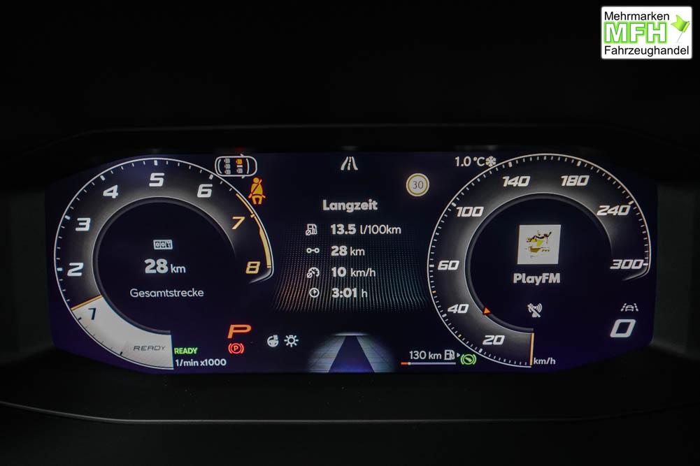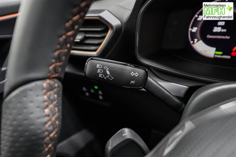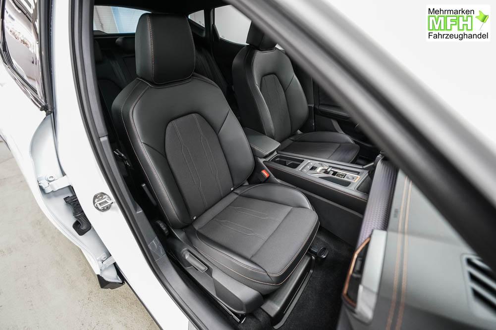 Beifahrersitz höhenverstellbar, Fahrersitz höhenverstellbar, Lederlenkrad, Lendenwirbelstütze, Mittelarmlehne vorne, Sitzbezug Stoff, geteilt umklappbare Rücksitzlehne, Lenkrad höhenverstellbar, Smart Wraparound Interieur Light, Beheizbares Lenkrad, Multifunktionslenkrad, Isofix, Isofix Beifahrersitz, abgedunkelte Scheiben, 18 Zoll Alufelgen , Dachreling schwarz, ABS, Alarmanlage, Außenspiegel elektrisch einstell-/anklappbar, Fensterheber elektrisch, Kopfairbags, Nebelscheinwerfer, Seitenairbags, Servolenkung, Sitzheizung, ESP, Wegfahrsperre, Außenspiegel beheizbar, Beifahrerairbag, Fahrerairbag, Parkpilot hinten, Parkpilot vorne, Reifendruckkontrolle, Regensensor, Lichtsensor, Digital Cockpit, Anhängekupplung schwenkbar, Tempomat Abstand ACC, Spurhalteassistent, Verkehrszeichenerkennung, LED-Scheinwerfer, Tagfahrlicht, Rückfahrkamera, Elektrische Heckklappe inkl. Virtual Pedal, KeylessEntry, StartStopSystem, Innenspiegel automatisch abbl., Müdigkeitswarnsystem, Notrufsystem, Schaltwippen, Klimaautomatik 3-Zonen, Geschwindigkeitsbegrenzer, Android Auto, Apple Carplay, Freisprecheinrichtung, Induktionsladestation, Sprachsteuerung, USB, Radio, Radio DAB, Bluetooth, Bordcomputer, IMMERSIVE by Sennheiser, Cupra Full Link, Full Link, variabler Ladeboden,