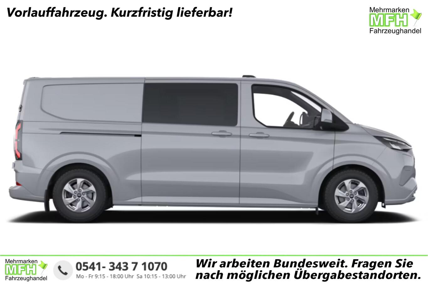 Anhängerkupplung: Kugelkopf fest, 13" Multifunktionsdisplay, 2. Sitzreihe mit 3er Sitzbank, 4 Lautsprecher, 6 Verzurrösen, Ablagefach an Vordersitz, Armlehne Fahrersitz, Außenspiegel elektr. verstell-, heiz- und anklappbar, Beifahrereinzelsitz (4-fach verstellbar), Blinkleuchte in Außenspiegel integriert, Fahrassistenz-System: Pre-Collision-System, Fahrersitz (4-fach verstellbar), Geschwindigkeits-Regelanlage (Tempomat), Heckflügeltüren (Öffnungswinkel 90/180°), Heckleuchten LED, Intelligenter Geschwindigkeits-Begrenzer, Lenkrad (Sensico) mit Multifunktion, LM-Felgen 6,5x16, Navigation in Verbindung mit dem Smartphone (über Apple Carplay / Android Auto /...), Parkpilotsystem vorn und hinten, Reifen 215/65 R16, Rückfahrkamera, Sitzheizung vorn, Smartphone-Schnittstelle (Apple CarPlay/Android Auto), Verglasung ab B-Säule verdunkelt, Wärmepumpe, Scheinwerfer LED (Blinkleuchten LED / Fahrassistenz-System: Fernlichtassistent (Scheinwerfer mit Abblendautomatik)), Bodenbelag: Vinyl im Lade-/Fahrgastraum, Elektromotor 160 kW, Fenster im Lade-/FG-Raum: - feststehend, 2.Reihe links, Feststellbremse elektrisch, Ford SYNC 4 mit AppLink und Touchscreen, Handschuhfach abschließbar, Heckflügeltüren, Heizung mit Umluftschaltung, Karosserie/Aufbau: Doppelkabine, KeyFree-System, Laderaumleuchte LED, extra hell, Power KeyFree-Startfunktion, Radstand 3500 mm, Schiebetür Lade-/Fahrgastraum rechts, Zul. Gesamtgewicht 3,20 t, USB-Schnittstelle, Anti-Blockier-System (ABS), Fahrassistenz-System: Notbrems-Assistent, Antriebsart: Heckantrieb, Elektron. Stabilitäts-Programm (ESP), Getriebe für Elektrofahrzeug, Klimaautomatik, Airbag Beifahrerseite, Airbag Beifahrerseite abschaltbar, Fensterheber elektrisch vorn mit Quickdown / -up-Schaltung Fahrer-/Beifahrerseite, Laderaumtrennwand ohne Fenster, Zentralverriegelung mit Fernbedienung, Frontscheibe heizbar, Fahrassistenz-System: Berganfahr-Assistent, Reifendruck-Kontrollsystem
