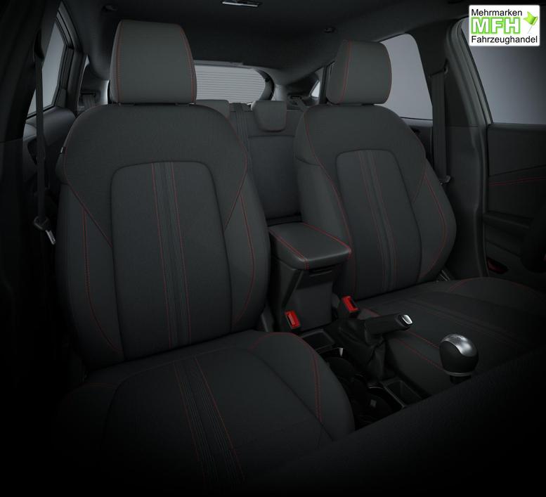 • Schwarzer Stoffbezug mit roter Naht