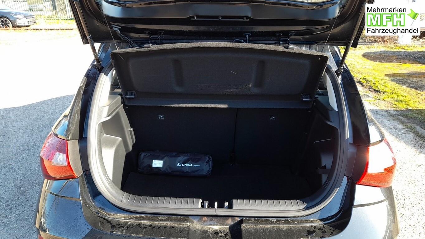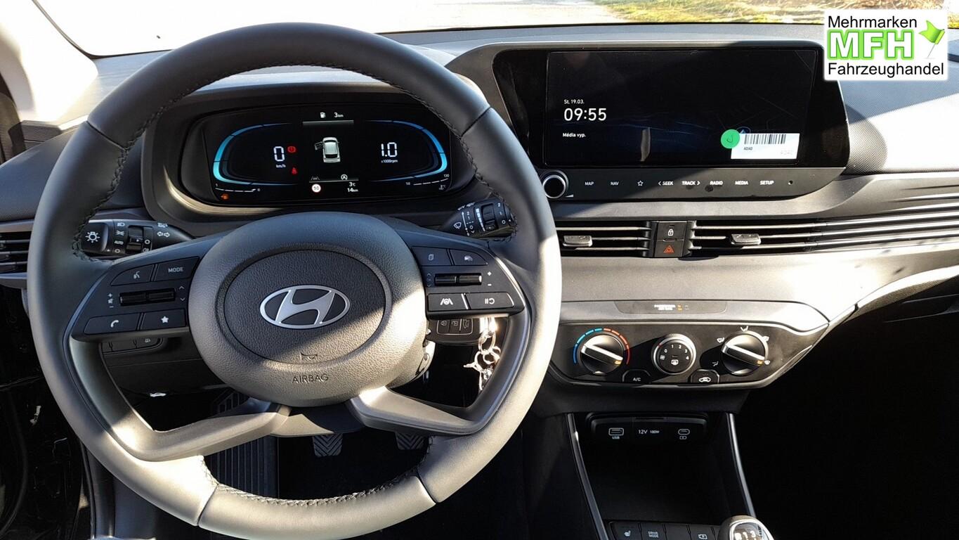 Armlehne vorn verschiebbar, mit Stauraum, Beifahrersitz mit Tasche an Rückseite, Ersatzrad, Innenspiegel abblendbar, Isofix-Aufnahmen für Kindersitz, Kopfstützen vorn verstellbar, Lenkrad heizbar, LM-Felgen 16 Zoll, Reifen 195/55 R16, Schadstoffarm nach Abgasnorm Euro 6e (EU6 EA), Sitzheizung vorn, SmartLink (Apple CarPlay und Android Auto), 4 Lautsprecher (Hochtöner), Audio-Navigationssystem (Touchscreen-Farbdisplay (10,25 Zoll)), Service-System: Remote Services (Blue Link) (Service-System: Online Update OTA (Over The Air)), Fahrassistenz-System: Autonome Notbremsfunktion inkl. Frontkollisionswarnung (FCA) (Fahrassistenz-System: Autonome Notbremsfunktion inkl. Fahrradfahrererkennung (FCA-Cyc.) / Fahrassistenz-System: Autonome Notbremsfunktion inkl. Fußgängererkennung (FCA-Ped.)), Außenspiegel lackiert, Fahrassistenz-System: Insassenalarm (ROA), Fahrassistenz-System: Multikollisionsbremse (Multi Collision Brake), Heckscheibe heizbar, Karosserie: 5-türig, Kopfstützen hinten verstellbar, Lenkrad (4-Speichen), Lenksäule (Lenkrad) höhenverstellbar, Lenksäule (Lenkrad) längsverstellbar, Motor 1,0 Ltr. - 74 kW TGDI KAT, Otto-Partikelfilter (OPF), Radioempfang digital (DAB+), Sitz vorn links höhenverstellbar, Sitzbezug / Polsterung: Stoff, Sonnenblenden mit Spiegel, Steckdose (12V-Anschluß) vorn, Türgriffe außen Wagenfarbe, Freisprecheinrichtung Bluetooth, USB-Anschluss (Typ C), USB-Anschluss hinten, USB-Anschluss Mittelkonsole, Anti-Blockier-System (ABS), Elektron. Stabilitätskontrolle (ESC) mit Bremsassistent, Wegfahrsperre (elektronisch), Getriebe 6-Gang, Klimaanlage, Airbag Beifahrerseite, Airbag Beifahrerseite abschaltbar, Airbag Fahrerseite, Fensterheber elektrisch hinten, Fensterheber elektrisch vorn, Kopf-Airbag-System, Rücksitzlehne geteilt/klappbar, Seitenairbag vorn, Zentralverriegelung mit Fernbedienung, Fahrer-Informations-System (Display 4,2 Zoll), Fahrassistenz-System: Berganfahrhilfe, Fahrassistenz-System: Verkehrszeichenerkennung, erweitert (Geschwindigkeits-Regel-/Begrenzeranlage), Geschwindigkeits-Regelanlage (Tempomat), Rückfahrkamera, Fahrassistenz-System: Sicherheitssystem mit automatischem Notruf (ERA GLONASS / eCall), Lenkrad (Leder) mit Multifunktion, Servolenkung, Außenspiegel elektr. verstell- und heizbar, beide, Einschaltautomatik für Fahrlicht / Lichtsensor, Einparkhilfe hinten, Fahrassistenz-System: aktiver Spurhalteassistent (LKAS, Lane Keep Assist System), Reifendruck-Kontrollsystem, Alarmanlage, Start/Stop-Anlage