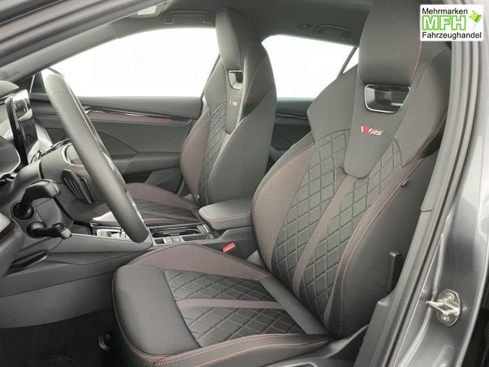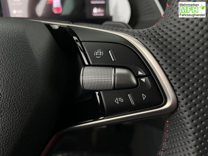 Infotainmentdisplay, Navigationssystem, SmartLink sowie Wireless Smart Link, Sprachsteuerung, LED Ambientebeleuchtung, LED Matrix Scheinwerfer, Lichtassistent, Akustikverglasung in den vorderen Seitenscheiben und Sunset, Ablagefach unter dem Beifahrersitz, Dachhimmelschwarz, Gepäcknetztrennwand, Supersport Lederlenkrad, var. Ladeboden im Gepäckraum inkl. Alu Querträger, 2-Zonen Climatronic, Infotainment Plus & Fahrassistenz Plus, 19'' Leichtmetallräder Elias anthrazit/schwarz, Bremssättel rot lackiert, Alarmanlage, Rücksitzlehnenmit Fernentriegelung, Sportsitze RS Stoff mit roten Ziernähten, beheizbare Vordersitze, Garantiezeit 5 Jahre max. 100.000 km Laufleistung, Digital Cockpit Plus, Fahrprofilauswahl, Head-Up Display, Intelligenter Geschwindigkeitsassistent (ISA), Intelligenter Parkassistent, Kessy, Parksensoren vorne und hinten, Rückfahrkamera, Speedlimiter, Stoßfänger RS, elektrische Heckklappenbedienung mit Komfortöffnung, Adaptives Fahrwerk DCC, Außenspeigel schwarz glänzend, Außenspiegel elektrisch anklappbar, Außenspiegel elektrisch beheizbar, Außenspiegel elektrisch einstellbar, Dachreling schwarz glänzend, Kühlergrillrahmen schwarz glänzend, Pedale im Alu Design, Sportauspuff Endrohr links/rechts, Vorbereitung Anhängerzugvorrichtung, EU-Fahrzeug mit Tageszulassung