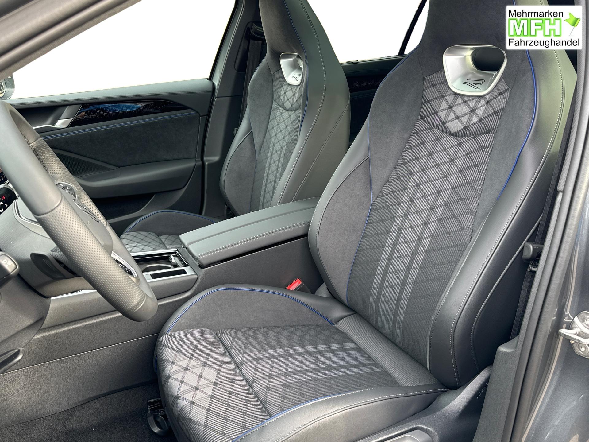 R-Line Sportsitze in Schwarz mit blauer Kontur, Sitzmittelbahnen der Vordersitze und der äußeren Rücksitzplätze in Stoff, Sitzwangen in Art Velours