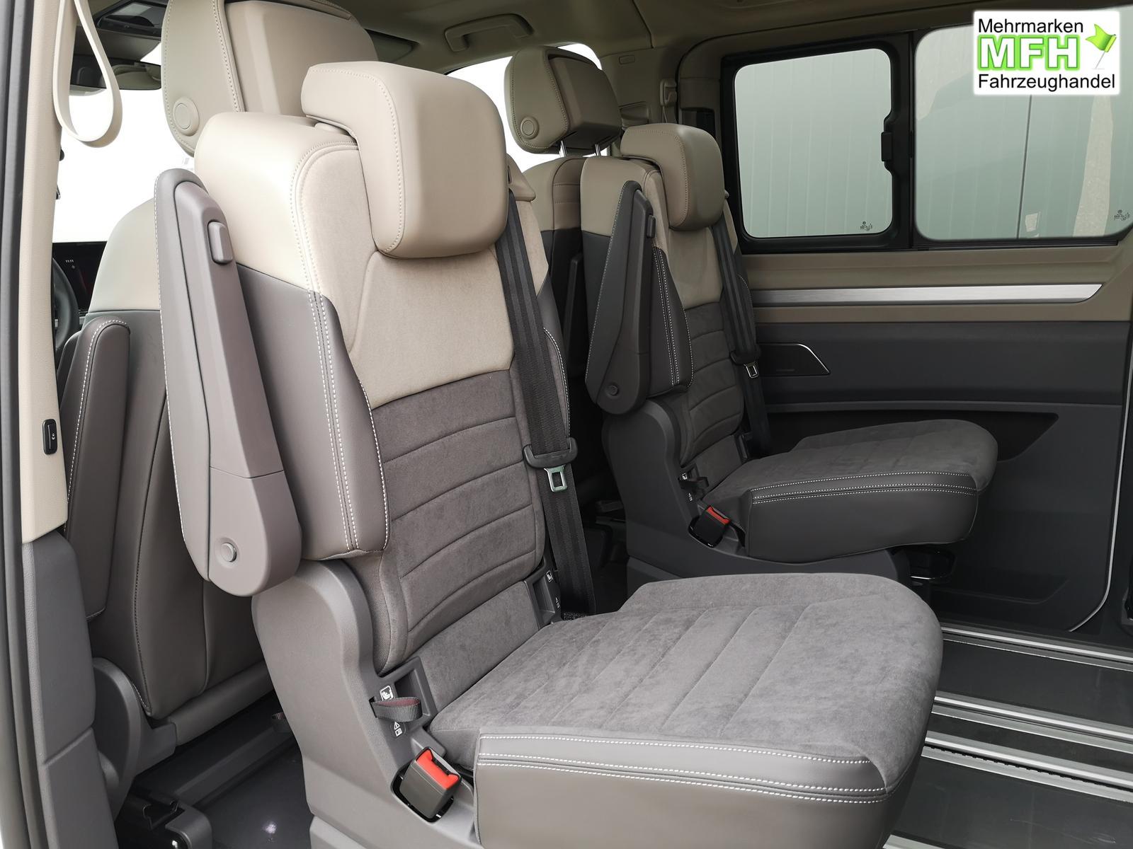Fahrzeug 8-fach-bereift, Leichtmetallräder 7,5J x 18 (Sport Edition Design TN28, schwarz glanzgedreht) mit Sommerreifen 235 50 R18, Leichtmetallräder 7,5 J x 18 ""Toshima"" schwarz mit Winterreifen (M+S Kennung inkl. Schneeflocke / Allwetterreifen), (0NP) Bulliplakette am Kotflügel, (1U3) Bodenschienen mit Multifunktionstisch inkl. 3 Becherhalter, verschiebbar auf der vollständigen Länge des Schienensystems, (2FT) Multifunktionslederlenkrad beheizbar mit Schaltwippen, (4A3) Sitzheizung vorne, (4GX) Frontscheibe beheizbar und geräuschdämmend, (4K5) Zentralverriegelung Keyless Advance (schlüsselloses Öffnen und Starten),(6I6) Travelassistent, (6KF) Scheinwerferleiste hinterleuchtet, (7AL) Diebstahlwarnanlage, (7J2) Digital Cockpit Pro, (7UY) Radio Navigationssystem Discover Pro, (9AH) Klimaanlage ""Air Care Climatronic"", (N2S) Sitzbezug Bi-Colour ""ArtVelours"", (1D2) Anhängerkupplung schwenkbar, (Z8A) Schiebefenster im Fahrgastraum links und rechts, Fenster ab B-Säule abgedunkelt, (ZBR) 7 Sitzer: Sitzvariante 2-2-3 (Vis-a-Vis entgegen der Fahrrichtung) inkl. 4 Armlehnen, (1LB) Fahrwerk 17 Zoll, (2H5) Fahrprofilauswahl, (3FG) Panoramaglasdach, (7VL) Warmwasserstandheizung im Fahrerhaus inkl. FFB, (7W7) Proaktives Insassenschutzsystem, (9IJ) Mobiltelefon-Schnittstelle ""Comfort"" inkl. induktive Ladestation, (9VV) Soundsystem ""Harman Kardon"" inkl. 13 Lautsprecher, 840 Watt Gesamtleistung und Subwoofer, (KS1) Head Up Display, (P2G) Parkpaket Advance, Parklenkassistent inkl. ""Area View"" inkl. Rückfahrkamera, (ZED) Easy Open Paket Advanced, Umfeldbeleuchtung an der Heckklappe, Ambientebeleuchtung 30-farbig, Heckklappe sowie Schiebetüren elektrisch inkl. Easy Open/Close Funktion, ABT Leistungssteigerung auf 132kW/180PS und 400Nm Drehmoment.