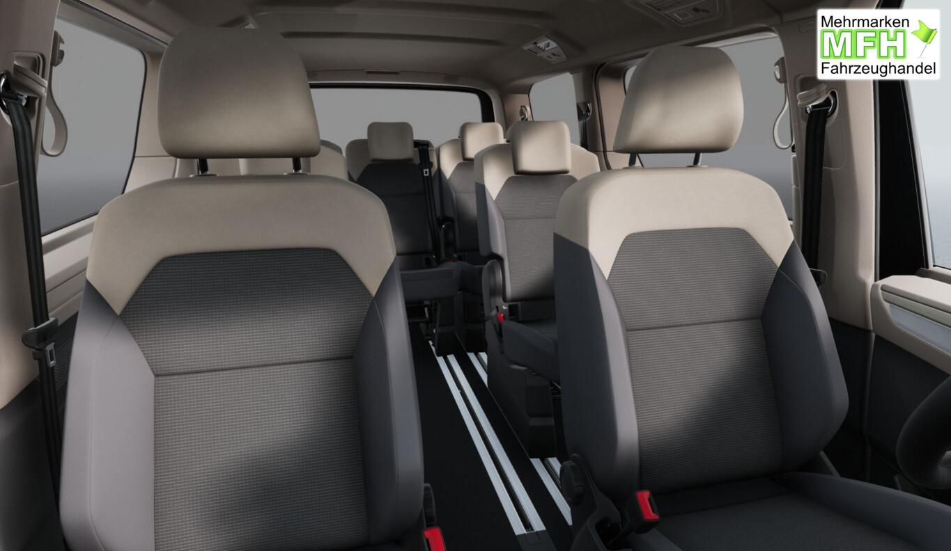 Airbag Fahrer-/Beifahrerseite, Beifahrerairbag abschaltbar, Anti-Blockier-System (ABS), Audio-Navigationssystem Discover Pro (Touchscreen-Farbdisplay 10", inkl. Streaming & Internet), Außenspiegel schwarz lackiert, Blinkleuchten LED in Außenspiegel integriert, Bodenbelag im Lade-/Fahrgastraum Teppich, Chromleisten seitlich und Heckklappe unten, Diebstahl-Warnanlage + Innenraumüberwachung / Abschleppschutz + Back-up-Horn, Digital Cockpit Pro (Instrumentenanzeige Digital), Elektron. Stabilitäts-Programm (ESP) mit Bremskraftverstärker elektro-mechanisch, Fahrassistenz-Paket Basic, Fahrassistenz-System: Ablenkungs- und Müdigkeitserkennung, Fahrassistenz-System: Ausweich-Assistent und Abbiege-Assistent, Fahrassistenz-System: Autom. Distanzregelung (ACC inkl. Stop&Go-Funktion), Fahrassistenz-System: Bremsassistent (HBA), Fahrassistenz-System: Dynamische Fernlichtregulierung (Dynamic Light Assist), Fahrassistenz-System: Parklenkassistent (Park Assist) inkl. Einparkhilfe vorn und hinten, Fahrassistenz-System: Spurhalteassistent (Lane Assist), Fahrassistenz-System: Spurwechselassistent (Side Assist) mit Auspark-Assistent und Ausstiegswarnung, Fahrassistenz-System: Verkehrszeichenerkennung, Fenster im Lade-/FG-Raum: - feststehend, vorn links, Fenster im Lade-/FG-Raum: - feststehend, vorn rechts, Fensterheber elektrisch vorn, Frontscheibe Verbundglas getönt, Funkschlüssel (2), Handschuhfach abschließbar, Handschuhfach beleuchtet, Heckklappe elektr. betätigt (öffnen + schliessen), Heckklappe mit Soft-Close-Funktion, Heckklappe mit Verglasung und Zuziehhilfe, Innenausstattung: Dekoreinlagen Dark Woodgrain Optic, Innenleuchtenkonzept im Fahrgastraum, Innenspiegel mit Abblendautomatik, Intelligent Speed Assist inkl. Geschwindigkeitsbegrenzer, Klimaanlage Climatronic 3-Zonen inkl. Fondbedienung, Ladekantenabdeckung in Kunststoff, mit Edelstahleinsatz, Laderaumunterteilung und Gepäcksicherungsnetz, Lautsprecher (8), Lenkrad (Leder) mit Multifunktion und Schaltfunktion, Lichtleiste zwischen Scheinwerfer, LM-Felgen 6,5x17 (Dundrod, schwarz), Matrix-LED-Scheinwerfer (IQ.Light), Mobile Online Dienste App-Connect inkl. App-Connect Wireless (Apple CarPlay, Android Auto), Mobile Online Dienste Vorbereitung We Connect und We Connect Plus inkl. Vorbereitung Onlinedienste, Mobiltelefon Schnittstelle Bluetooth, Multimedia-Schnittstelle 2 x USB vorn und 4 x USB-Ladeanschluß Fahrgastraum (Typ C), Notrufsystem, Pedale Edelstahl, Radioempfang digital (DAB+), Regensensor, Reifen 235/55 R17, Reifenkontroll-Anzeige, Rückfahrkamera, Schadstoffarm nach Abgasnorm Euro 6e (EU6 EA), Schiebetür Lade-/Fahrgastraum links elektr. betätigt, Schiebetür Lade-/Fahrgastraum rechts elektr. betätigt, Schlechtwetter-Licht, Schließ-/Startsystem Keyless Advanced mit Safesicherung, Schmutzfänger vorn und hinten, Schubladen unter Rücksitze außen und 2 Abfallbehälter, Seitenairbag / Kopfairbag / Center-Airbag vorn und Kopfairbag hinten, Service-System: Intelligente Fahrzeugvernetzung (Car2X), Servolenkung elektro-mechanisch, geschwindigkeitsabhängig, Sitz-Paket: 7-Sitzer, 2-2-3 (2 Einzelsitze, 2 Einzelsitze, 3 Einzelsitze), Sitzbezug / Polsterung: ArtVelours / Kunstleder, Sitze im Fahrerhaus: 4 Armlehnen, Lendenwirbelstützen elektr. und Klapptische, Sitze im Fahrerhaus: Beifahrersitz höhenverstellbar, Sitze im Fahrerhaus: Fahrer- und Beifahrersitz heizbar, Sitze im Fahrerhaus: Fahrersitz höhenverstellbar, Sitze im Lade-/FG-Raum: 1.Reihe mit 2 Armlehnen innen (abnehmbar), Sitze im Lade-/FG-Raum: 2.Reihe mit Vorbereitung für 2 Armlehnen innen, Sonnenblenden mit Spiegel (beleuchtet), Sprachsteuerungs-System, Tagfahrlicht und Assistenzfahrlicht mit Coming Home / Leaving Home, Umfeldbeleuchtung seitlich mit Projektionsfunktion, Umfeldleuchte in Heckklappe und Ambiente-Beleuchtung (30 Farben), Verglasung hinten abgedunkelt (65 %), Warnanlage für Sicherheitsgurte vorn und hinten, Wegfahrsperre (elektronisch), Zusatzheizung, Elektromotor 85 kW (Hybridantrieb), Hybrid 180 kW (Motor 1,5 Ltr. - 130 kW TSI), Karosserie/Aufbau: Bus, Otto-Partikelfilter (OPF), Radstand 3124 mm, Zul. Gesamtgewicht 2,95 t, Antriebsart: Allradantrieb, Getriebe 6-Gang - Doppelkupplungsgetriebe DSG