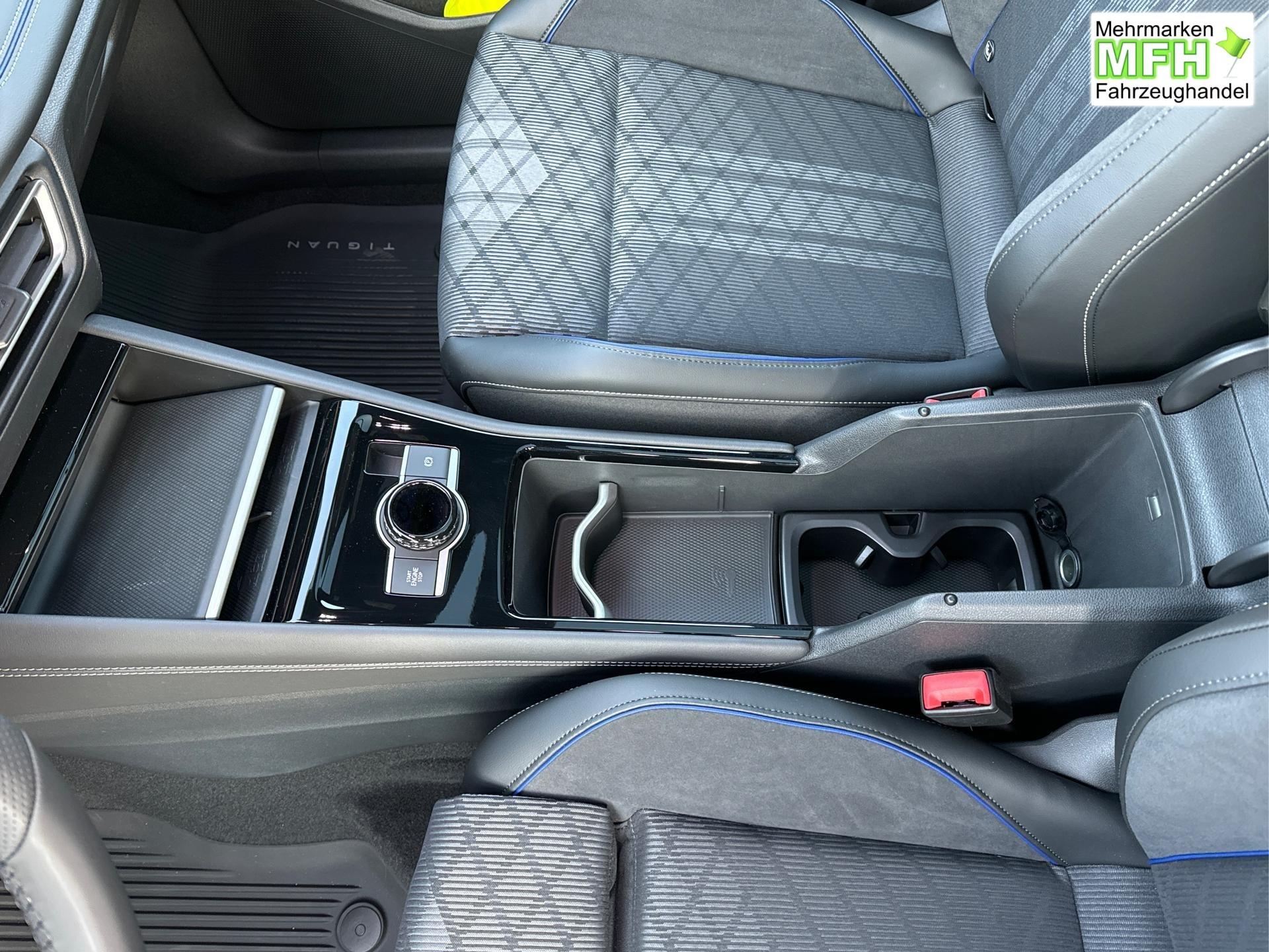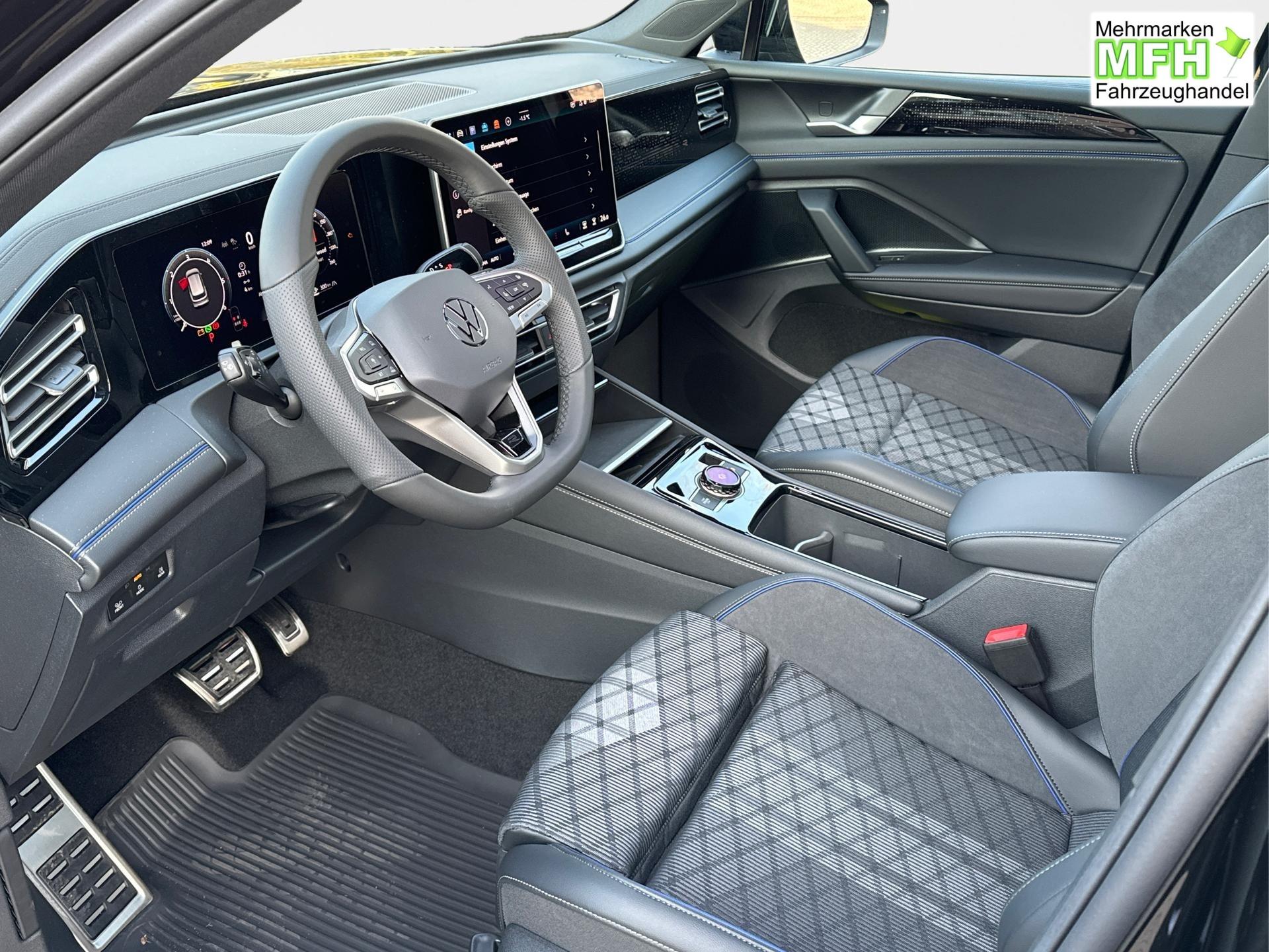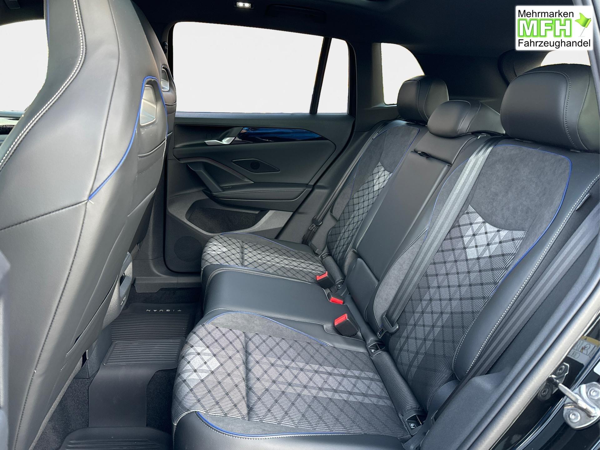 Innenausstattung R-Line Sportsitze mit integrierter Kopfstütze in Schwarz mit blauer Kontur, Sitzmittelbahnen der Vordersitze und der äußeren Rücksitzplätze in Stoff, Sitzwangen in Art Velours