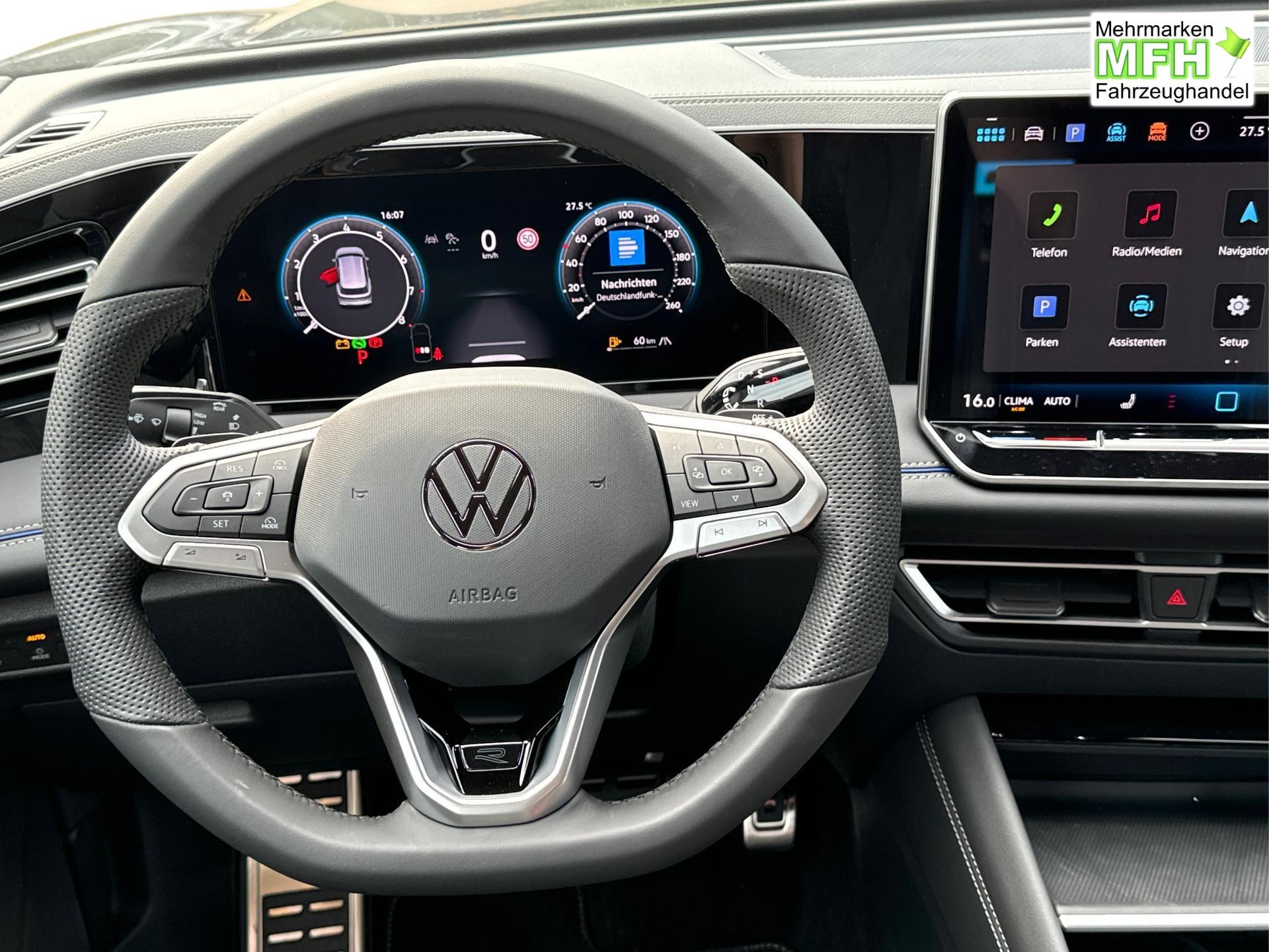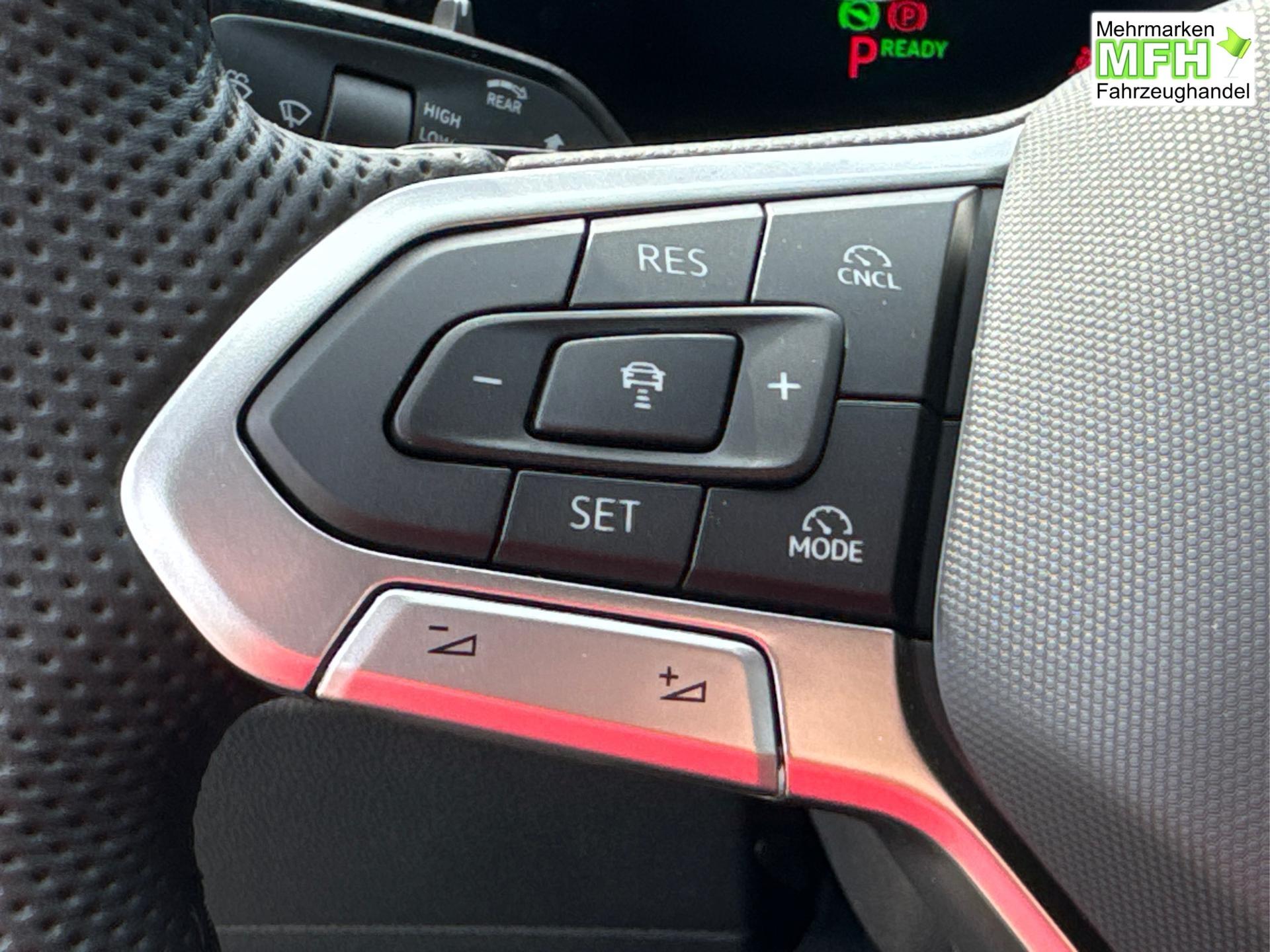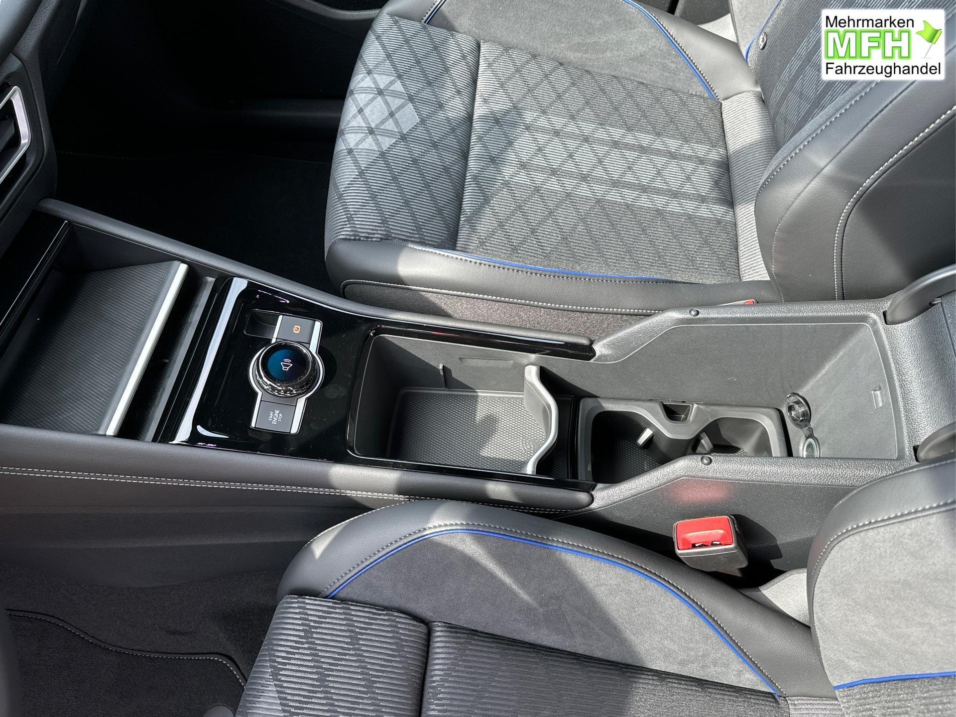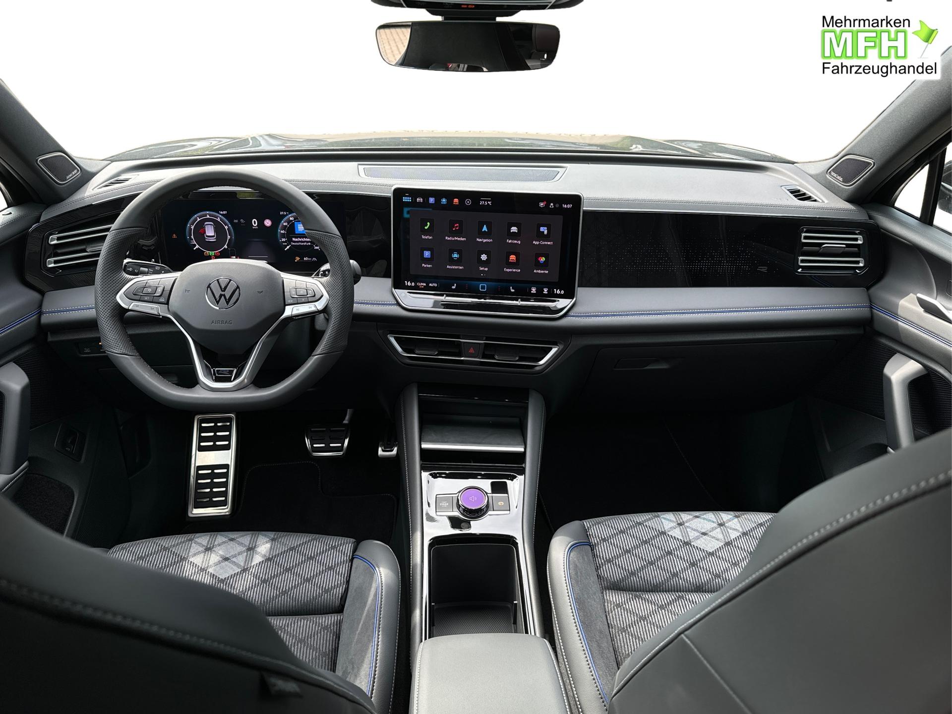 Innenausstattung R-Line Sportsitze mit integrierter Kopfstütze in Schwarz mit blauer Kontur, Sitzmittelbahnen der Vordersitze und der äußeren Rücksitzplätze in Stoff, Sitzwangen in Art Velours